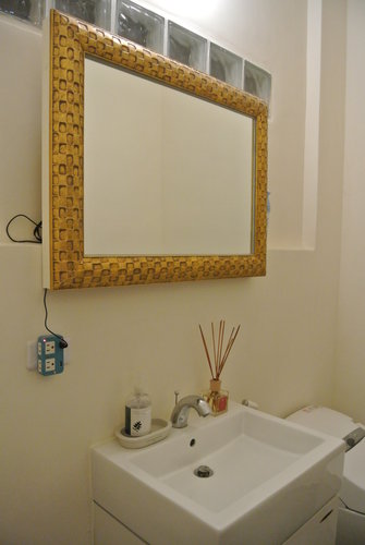 洗手台的鏡面跟廁所的門是一樣的花色造型