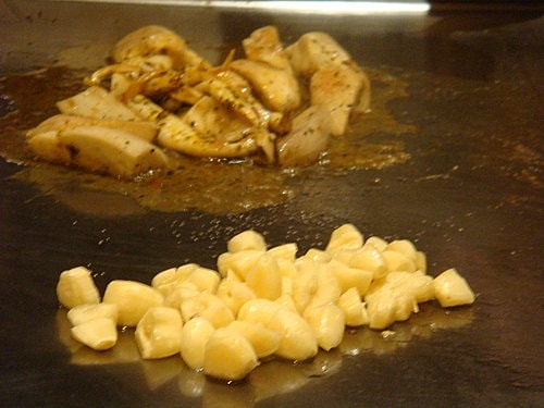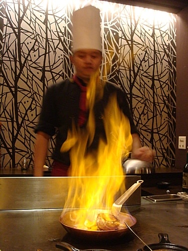 廚師正在鐵板上準備著我們的主餐跟熱沙拉