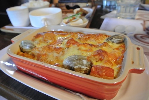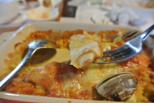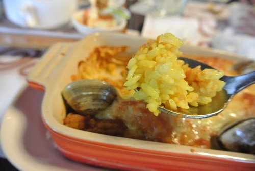 焗烤的飯不知道加了什麼,看起來黃黃的,但我吃不出來什麼味道