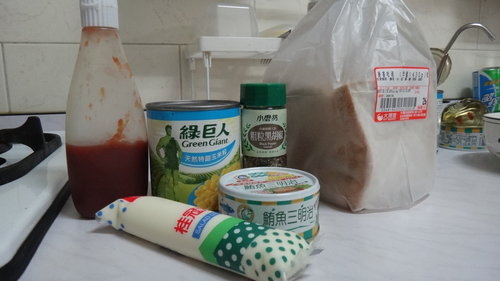 某年某月某天~~因為這陣子一直很想吃披薩的味道 於是下了班跑去買家裡沒有的材料回家DIY 材料:土司(我喜歡雜糧口味的) 、 可果美蕃茄醬(正統是要用披薩醬,但怕買了不常用,所以之前用蕃茄醬味道也不錯,所以…..) 鮪魚三明治(想吃鮪魚沙拉口味,而且…