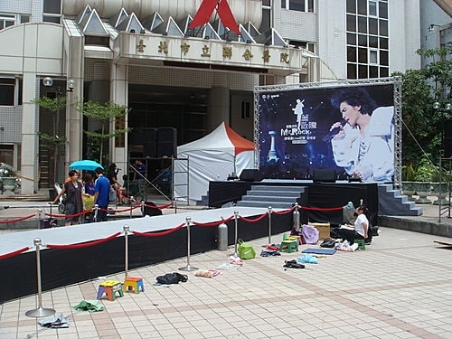 99.07.11 活動訂在下午2點 要去餐廳前經過簽唱會現場,已經陸續有很多粉絲已經到達 頂著酷夏的大太陽,為了見敬騰一面大家都忘了炎熱的天氣 才十一點多….舞台已經搭建好了 走道的兩旁擺了很多佔…