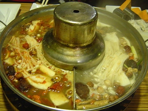 又到了聚餐的日子 成員:煉哥、相公、世偉、阿弟仔、小江、愛美、素梅、美慧、我本人。。 這次我們選了新開幕的〞鍋大爺〞做為聚餐的地點 一走進店門口就被那濃濃的香味吸引,肚子忍不住咕嚕咕嚕起來 左邊是辣的,看起來紅紅的有很多辣椒,其實吃起來不辣喔 而且煮過的…