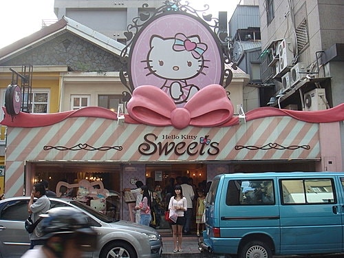 97.10.10 經過〞無緣〞的Hello Kitty餐廳 想說都來了,就在外面拍拍照再回去好了 小妹叫我到對面馬路拍整間餐廳門口 站在店門口的是我的小妹喔 門口櫥窗擺了很多Kitty的東西 很多路人都停下來猛拍照 雖然我沒有特別喜愛Hello Kitty 但來到餐廳看到這…