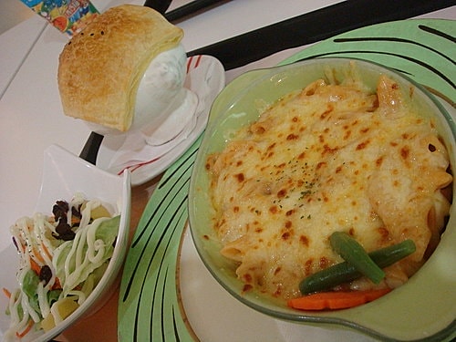 中午吃完白甘蔗涮涮鍋之後〞傲肖連〞的我跟文便跑回家去睡了午覺從二點多睡到四五點醒來後突然覺得肚子又餓了,打了電話給小辣椒,結果他今天要去大江想說順便跟他拿東西、也順便去吃東西本來只想吃個焗烤肉醬通心麵但加$60就有酥皮濃湯跟沙拉,貪心的我決定加$60沙拉…