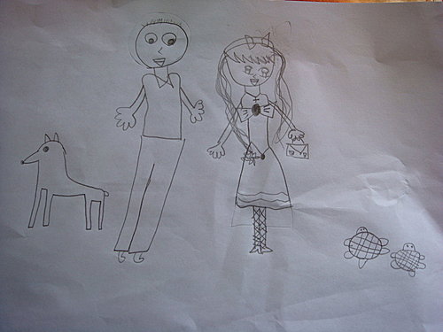 看的出來這幅畫在畫什麼嗎??這是柔柔畫的因為前一天看到柔柔畫了她爸爸、媽媽、她跟弟弟的圖畫文就問她說〞為什麼沒有畫舅舅跟舅媽〞還叫她要加上家裡的〞小黑〞及2隻烏龜結果隔天她就畫了這幅畫小朋友畫的畫就是這麼可愛女生就留著長長的頭髮、還要穿裙子的喔~~真是天…