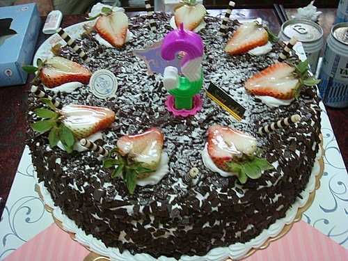 親愛的小表弟生日到了因為剛好不是假日所以我提前幫他慶生了 蛋糕是去丹崎麵包買的因為小孩子都喜歡吃巧克力,所以我買黑森林蛋糕。。。10吋但是我搞不懂一般人是過實歲還是虛歲的所以我請小姐給我2跟3的蠟蠋結果~~他們說要過虛歲的所以插上了「3」歲的蠟蠋 小小年紀還…