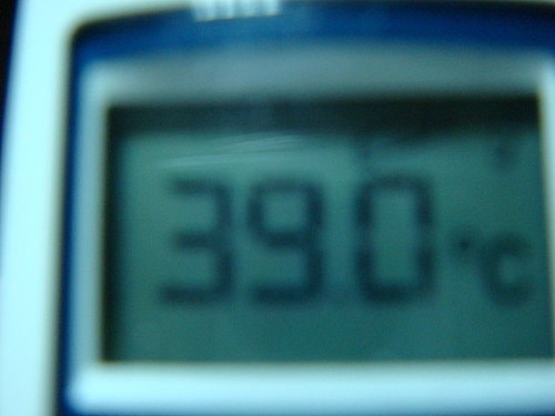 那天起床後覺得全身腰酸背痛, 心想肯定是被傳染感冒了, 但還是硬去上班啦…不過一下子就受不了, 好不容易忍到中午~~~下午就請假回家啦!! 後來想說休息一下應該就會比較好, 沒想到晚上卻發燒了, 拿了溫度計來量…..居然39℃ 天哪~~~~~~ 那時已經晚…